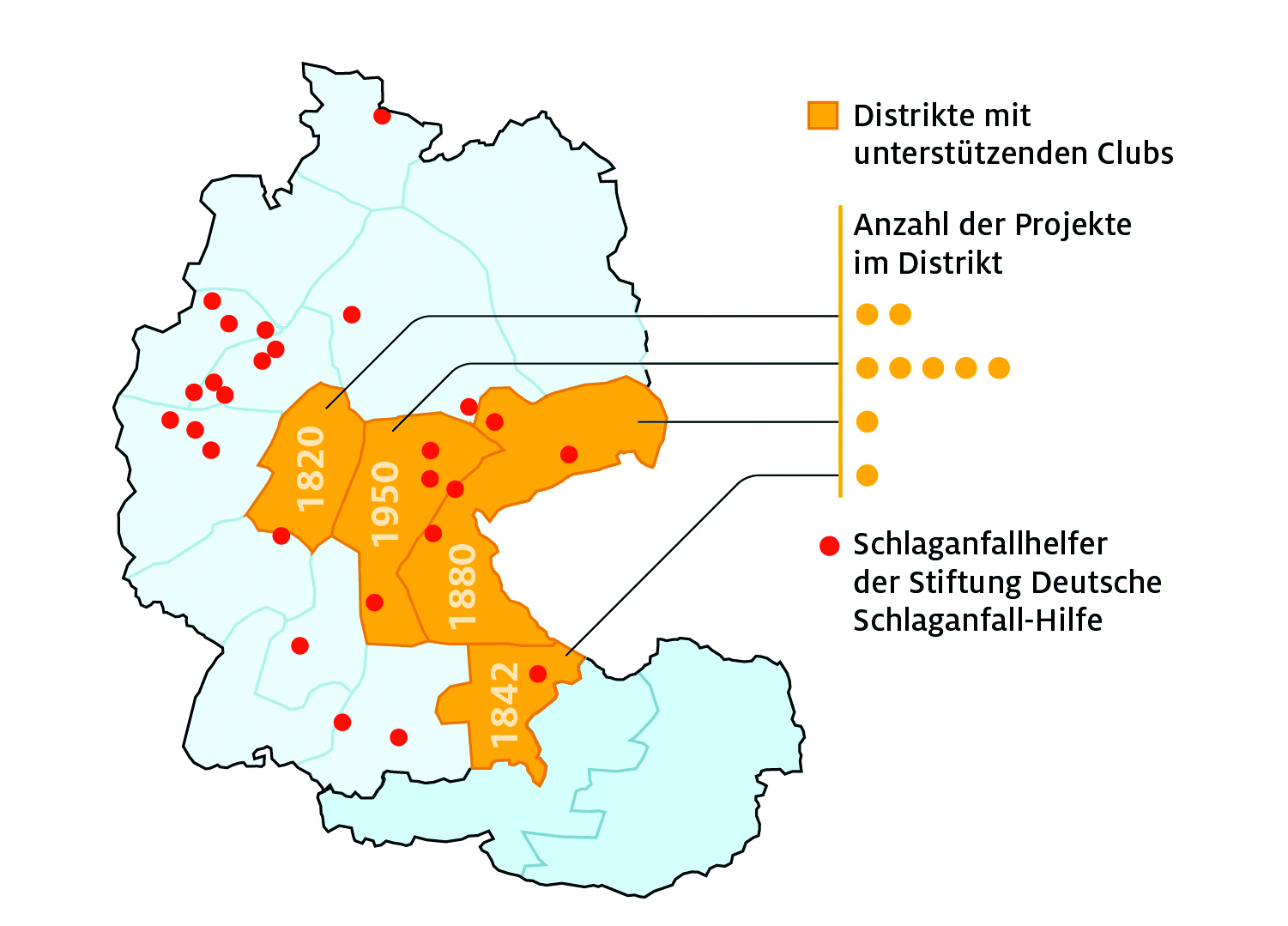 Und die anderen 85 Prozent? Brauchen ebenso Hilfe, aber eben zu Hause, im Alltag. Hier leisten – neben den professionellen Schlaganfalllotsen – die ehrenamtlichen Schlaganfallhelfer Unterstützung. Seit 2016 fördern diverse Rotary Clubs diese von der Stiftung Deutsche Schlaganfall-Hilfe qualifizierte Ausbildung. Den Anfang machte damals der RC Ansbach unter der Regie des Neurologen Udo Feldheim in D1950. Sein Projekt ist inzwischen in weitere drei Distrikte mit großem Erfolg exportiert worden.
