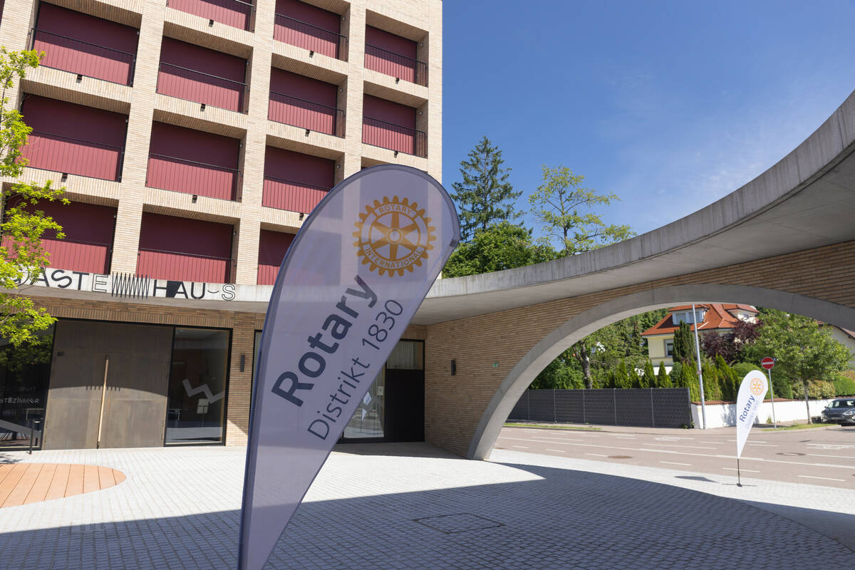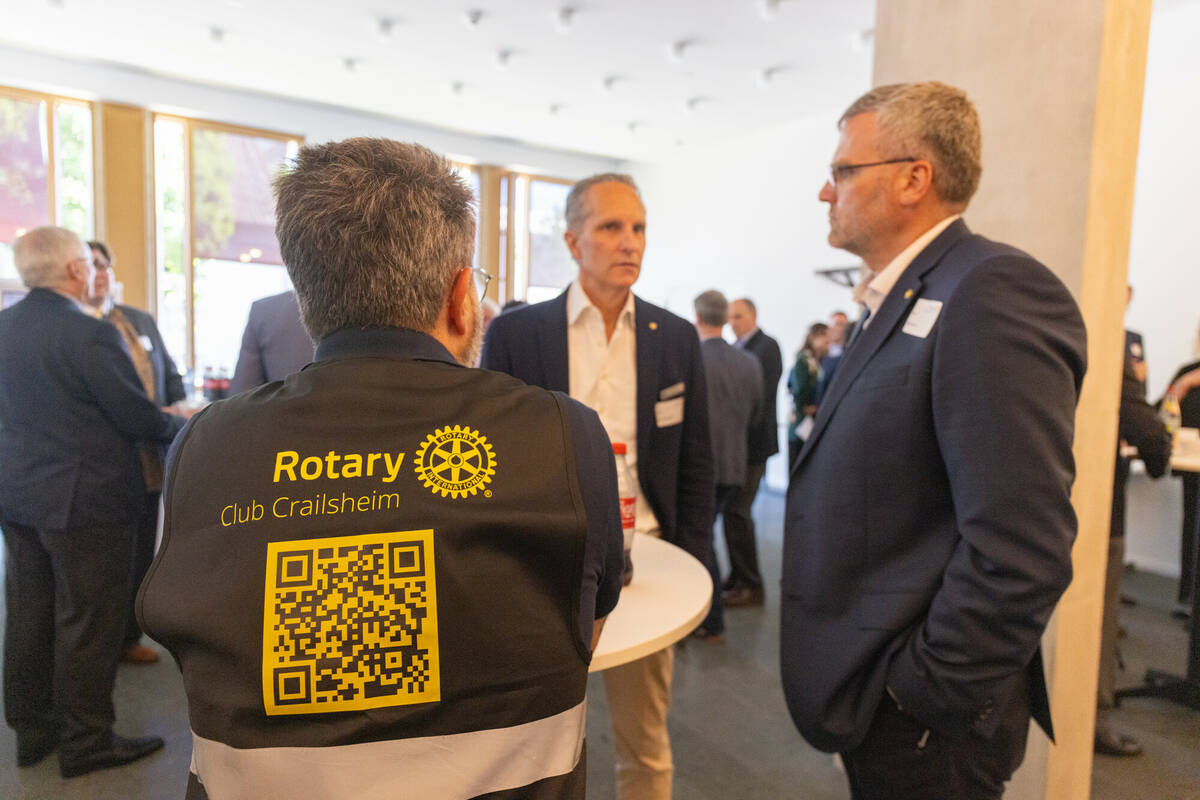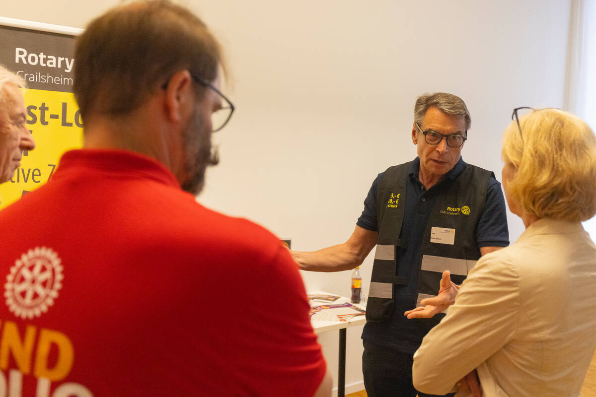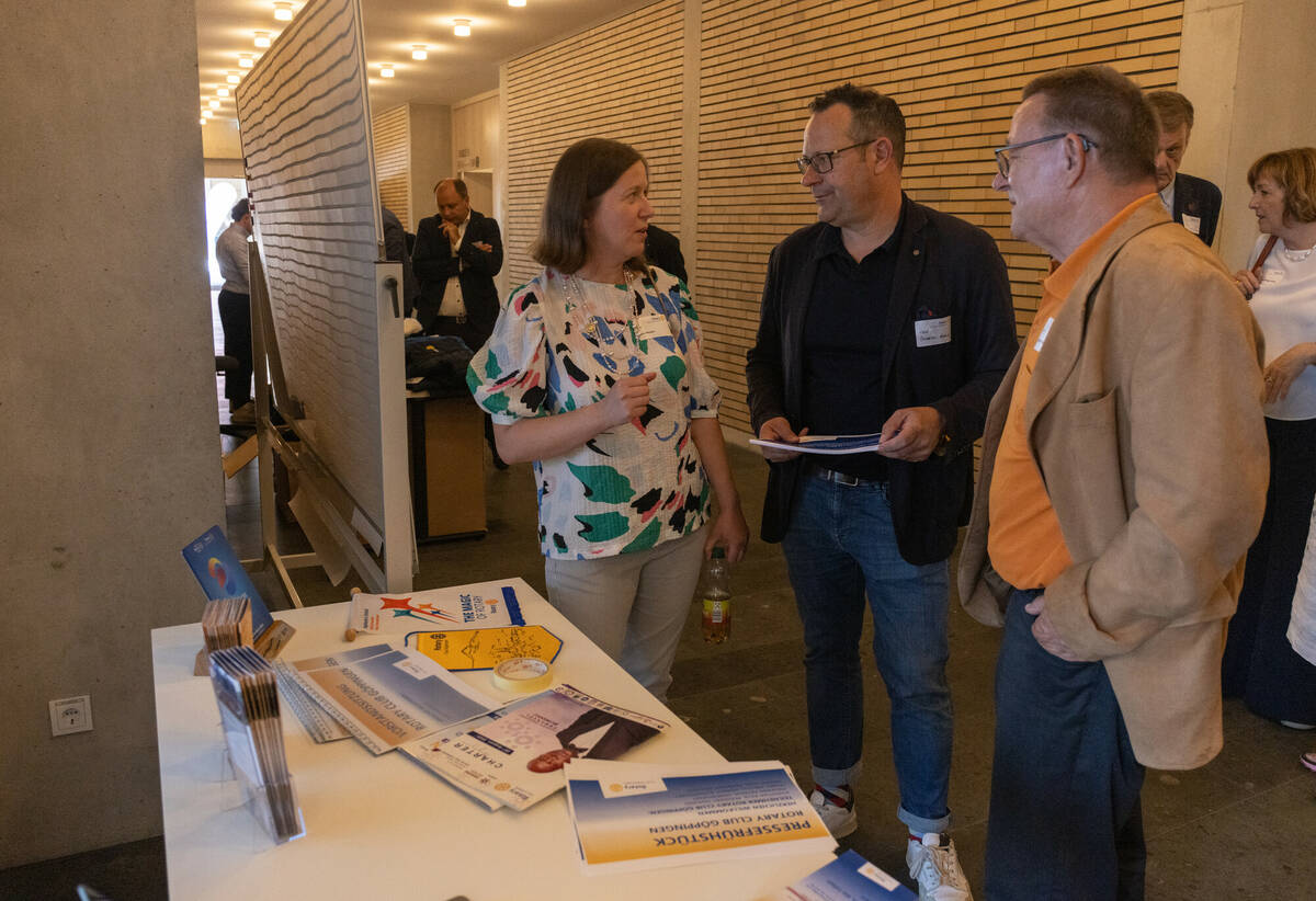 Im Foyer zeigten Clubs die Vielfalt rotarischer Projekte – lokal und global. Besonders berührt hat das Projekt des Rotary Club Göppingen: Mit dem Global Grant „Rain Water Harvesting“ versorgt der Club zehn Schulen in Uganda mit sauberem Wasser – und schafft nachhaltige Perspektiven für Kinder. Incoming Governorin Oana Dendorf lauscht Christian Gaus (RC Göppingen), der im Haus der Freundschaft von der Reise nach Uganda berichtet.