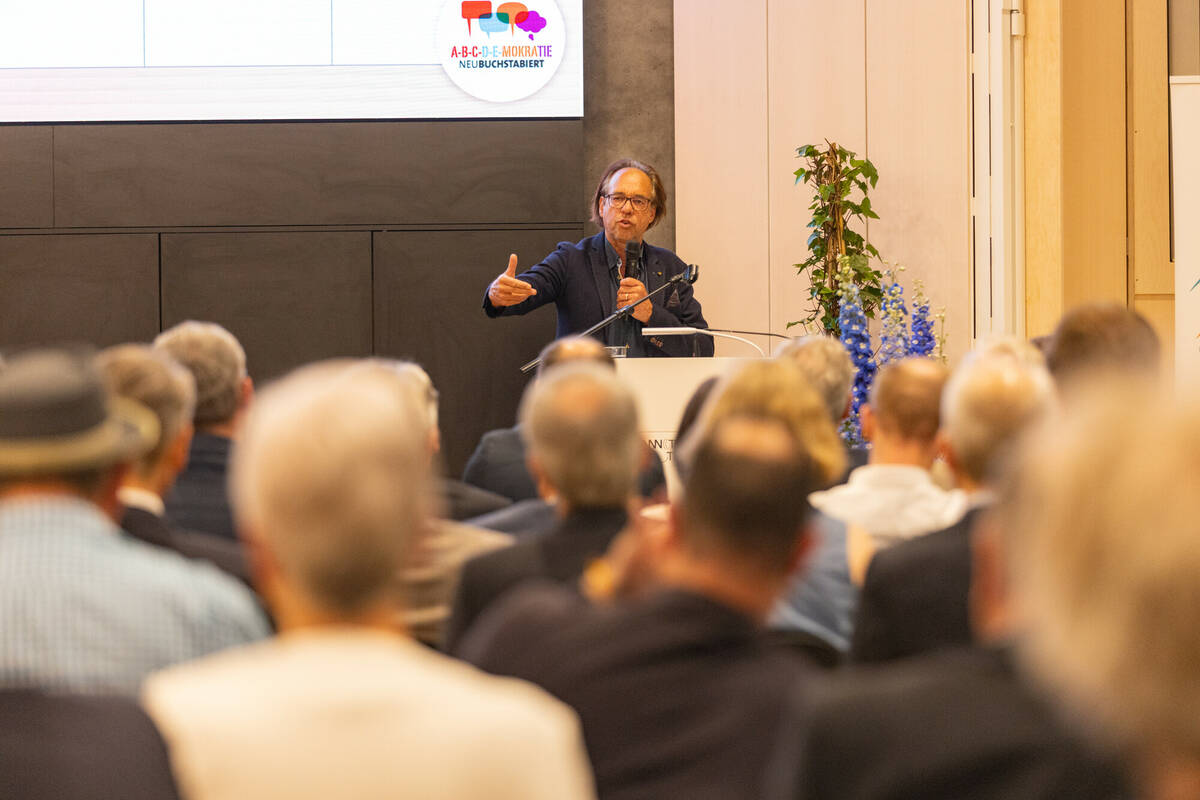 Den Auftakt zum zweiten Schwerpunktthema „Demokratie und Friedensförderung“ machte der Comedian Christoph Sonntag, der König des schwäbischen Kabaretts. Er stellte ein Herzensprojekt seiner Stiftung vor, welches Rotary im Distrikt unterstützte: A-B-C-D-E-Mokratie neu buchstabiert! Gerade junge Menschen stehen heute unter dem Einfluss von Fake News, Populismus und vermeintlich einfachen Antworten. Viele verlieren den Bezug zu demokratischen Werten – oder kennen sie gar nicht erst. Hier setzt das Projekt an.