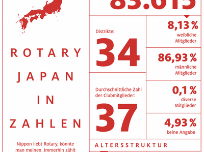 TitelthemaRotary Japan in Zahlen Nippon liebt Rotary, könnte man meinen. Immerhin zählt Japan etwa 16.000 Mitglieder mehr als Deutschland und Österreich zusammen. Doch die Zahlen sind… Kyoko Nozaki | 25-04-01