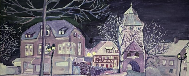--> zeigt den "Stadtturm Höchstadt in der Nacht" (Gouache auf Leinwand), gemalt von Isabel Pfleger, zehn Jahre; Kalender erscheint bereits im elften Jahr