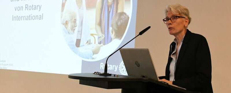 Einen etwas weiteren Anfahrtsweg als Patrick Plöger hatte Stephanie Theobald. Sie arbeitet hauptamtlich im RI-Büro Zürich, was Europa und Afrika abdeckt. In ihrer Präsentation informierte die Frau aus der Schweiz sowohl über die Strukturen von Rotary International, die (sinkenden) Mitgliederzahlen, die Arbeitsbereiche des Schweizer Stützpunktes und vor allem darüber, was RI aus Zürich für die einzelnen Clubs und deren Mitglieder leisten kann. So auch für den Distrikt 1870.