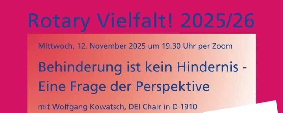 Der Titel der Veranstaltung ist: "Rotary – Vielfalt vor Ort: Behinderung ist kein Hindernis". Als Gast wird Wolfgang Kowatsch, Chair für Diversity, Equity and Inclusion im Distrikt 1910, erwartet.