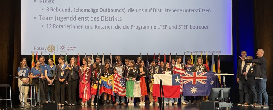 Einen besonderen Platz im Programm wird dem Jugenddienst eingeräumt. Es herrscht internationales Flair. Auf der Bühne sind die Fahnen der Länder zu sehen, mit denen Jugendliche aus dem Distrikt im Austausch stehen. In diesem Jahr gibt es 13 sogenannte „Outbounds“ und 10 „Inbounds“ – also Jugendliche, die ein Jahr über Rotary im Ausland leben oder vom Ausland hier im Distrikt untergebracht sind. In weiteren kürzeren Austauschprogrammen sind sogar insgesamt 43 Jugendliche involviert. Die Jugendlichen präsentieren sich selbst auf der Bühne, berichten vom Erlebten und singen zusammen in vielen Sprachen.