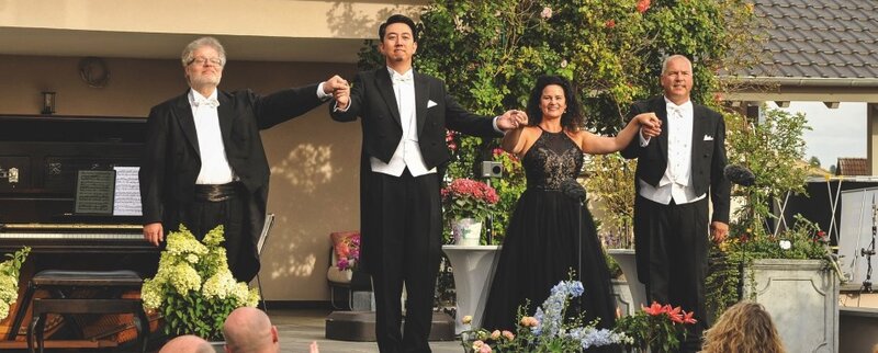 Großen Zuspruch fand die Corona-bedingte Idee von Rotarier und Heldentenor Stefan Vinke (r.) und seiner Frau Sabine (2. v. r.), in ihrem Garten die Richard-Wagner-Festspiele stattfinden zu lassen. Klassik Radio und welt.de streamten das Eröffnungskonzert live. Über 100.000 Zuschauer sahen sich den Stream an.