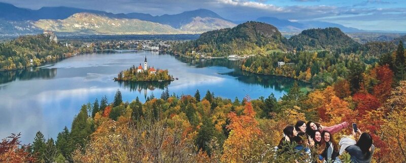 Touristen posieren über dem Bleder See im Nordwesten Sloweniens. Snezana Suput Gulin aus dem Rotary Club Ljubljana in Slowenien hatte dieses Foto beim RI Photo Contest 2022 eingereicht, und es wurde lobend erwähnt. Die Juroren sagten: „Es ist eine wunderschöne Landschaft mit den sich verändernden Farben der Bäume. Auch das Wasser, in dem sich der Himmel spiegelt, ist eine schöne Komponente.“
