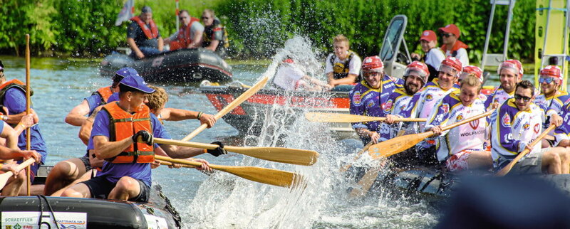 Für diesen Großevent stellt das Ausbildungszentrum Infanterie der Bundeswehr in Hammelburg jedes Jahr Schlauchboote, Paddel und Schwimmwesten zur Verfügung. Meidel stellt klar: „Ohne die Boote und Unterstützung gäbe es kein Rennen!" Die Bundeswehr liefert das Material an, übernimmt das fachgerechte Aufpumpen und kümmert sich nach dem Rennen um die Reinigung und Lagerung bis zum nächsten Einsatz. An Land sorgen rund 30 Auszubildende der Firma Schaeffler zusammen mit Helfern des Technischen Hilfswerks (THW) und der Wasserwacht Ortsgruppe Sennfeld für die Sicherheit und Gesundheit der Besucher. Auf dem Wasser werden alle Bootsfahrer von der Wasserwacht Ortsgruppe Schweinfurt betreut. Rund 100 aktive Helfer greifen zusätzlich zu den Rotariern dem Rad so in die Speichen.