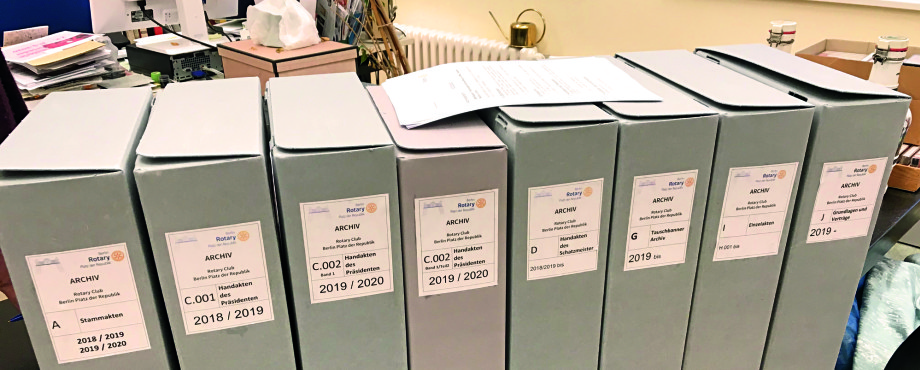 Der RC Berlin-Platz der Republik hat im Rahmen einer ersten Archiv-Ablieferung an das Mitte Museum, zuständiges Archiv des Bezirksamtes Berlin-Mitte für Wedding, Mitte und Tiergarten, seine Gründungsakten und die Akten des rotarischen Jahres 2018 eingelagert und damit das Clubarchiv als Privatdepot im Mitte Museum eröffnet.