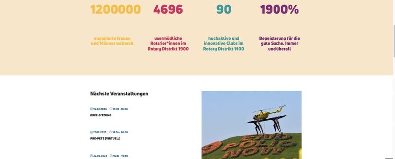 Nach über einer halben Dekade geht unser neuer Webauftritt online. Entstanden ist eine Website, auf der die wichtigsten Informationen, die immer wieder abgefragt werden, sehr schlank zur Verfügung gestellt werden. Im Einzelnen sind das Termine, Ansprechpartner Governorbriefe und Downloads. Alle weiterführenden Infos zu Rotary, Polio, Rotaract, Rotex und anderem haben wir mit Links zu den entsprechenden Seiten versehen. Dort gibt es dann die jeweils aktuellsten Infos in der vollen Tiefe.
