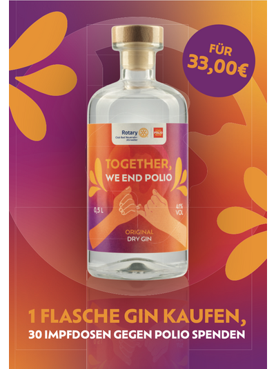 Der handgemachte Gin von der Ahr bringt Leidenschaft, Regionalität und den Einsatz für einen guten Zweck zusammen. Gemeinsam mit der Eifel Destillerie P.J. Schütz wurden dafür vom Rotary Club Bad Neuenahr-Ahrweiler 1.000 Flaschen erstklassigen Gins produziert. Die Käufer sollen mit jedem Schritt Gutes tun: Drei Euro pro Flasche gehen an End Polio Now.