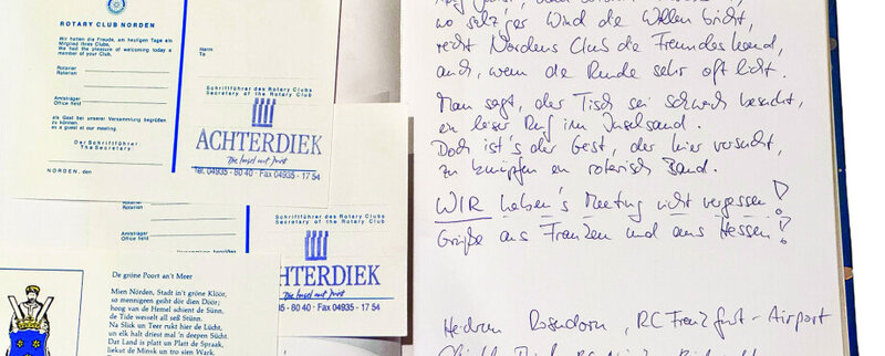 Angeregt durch den Artikel „Sommerferien mit Anschluss“ zum Thema Rotary-Tische in der August-Ausgabe, erreichte die Redaktion des Rotary Magazins ein Gruß von der ostfriesischen Insel Juist im niedersächsischen Wattenmeer. Gemeinsam mit dort urlaubenden Freunden hatten Christoph Thiel aus dem RC Nürnberg-Reichswald und seine Frau Sabine Thiel aus dem RC Nürnberg-Connect wie schon in den letzten Jahren den rotarischen Tisch besucht. Und dann noch genau nachgezählt: Seit ihrem letzten Besuch vor genau 364 Tagen waren laut Gästebuch immerhin 15 Rotarier in sechs Meetings auf Juist als Gäste präsent.