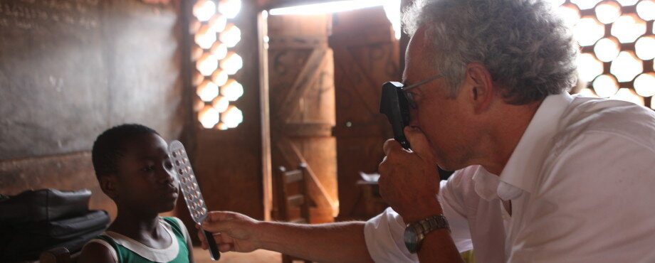Auch Otto Dollinger lässt sich nicht aus der Ruhe bringen: „Auf so etwas muss man hier immer gefasst sein.“ Der Augenarzt vom RC Biberach an der Riß ist für zwei Wochen für die German Rotary Volunteer Doctors (GRVD) mit seiner Frau, einer Orthoptistin, nach Ghana gereist. Ehrenamtlich arbeiten sie am Krankenhaus in Techiman. Es ist nicht ihr erster Einsatz für GRVD. Auch nicht ihr erster Einsatz im Outreach. „Wir sind zusammen mit einem neunköpfigen Team der Augenklinik heute morgen um sechs Uhr aufgebrochen. Ziel sind vier Dörfer, die wir heute anfahren.“