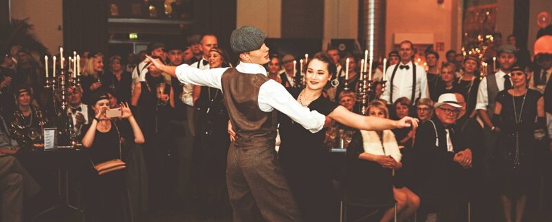Rund 240 Gäste kamen im Stil der Goldenen Zwanziger in den Ahrensburger Marstall. Zu der Party des RC Großhansdorf gehörte auch, den für die Zeit typischen Charleston zu tanzen. Für die entsprechende Sicherheit auf dem Parkett hatten die Clubfreunde bereits im Vorfeld an einem Tanzkursus teilgenommen, Unterricht gab es aber auch während des Events.