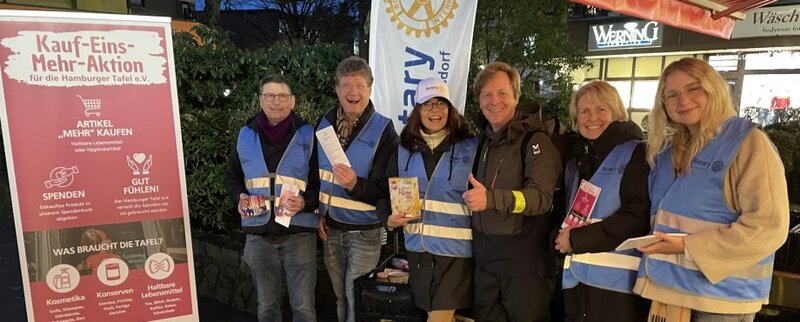 In acht Schichten an zwei Tagen sammelten 20 engagierte Helferinnen und Helfer Spenden für den Hamburger Tafel e.V. Dank der großzügigen Unterstützung der Kundinnen und Kunden des Frischemarkts Simon füllten die Rotarier 118 Kisten mit haltbaren Lebensmitteln und Hygieneartikeln im Wert von rund 14.000 Euro, darunter Nudeln, Reis, Konserven, Zahnpasta und Seife. Zudem nahmen sie insgesamt 600 Euro Barspenden entgegen, die der Förderverein auf 2000 Euro aufstockte. Diese Summe leitete der Club bereits vollständig an die Hamburger Tafel weiter, um diese gezielt zu unterstützen.