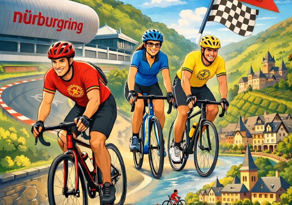 Start ist um 10 Uhr am Info-Center des Nürburgrings. Zuerst geht es über einen kleinen Teil der Rennstrecke und dann durch die Eifel hinab an die Mosel zum Bio-Weingut Freiherr von Landenberg. Es wird zwei alternative Streckenverläufe geben, so dass die Strecke für Rennradfahrer und Fahrer mit Mountainbikes beziehungsweise Gravelbikes geeignet ist. Für jene, denen die gesamte Strecke zu weit ist, gibt es von einem Zwischenstopp aus einen Shuttle-Service zur Mosel.