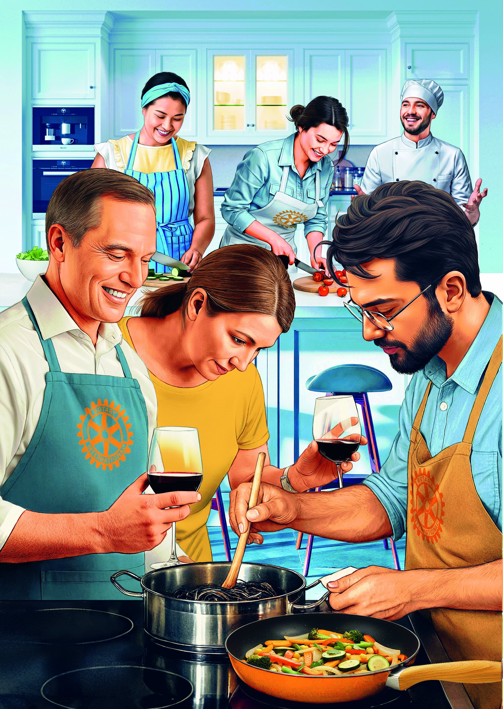 Dem RC Lüdinghaus gelingt es mit diesem Event, gleich mehrere Benefits zu generieren. Die Einrichtung, in der gekocht wird, erhält eine Spende, und die Inbounds aus dem Rotary-Jugendaustausch stehen an diesem Abend mit am Herd. „Die bringen Rezepte aus ihrer Heimat mit“, erklärt Oberhaus. Hinzu kommen ein guter Wein und gute Gespräche, und schon ist ein ganz besonderes Meetingformat kreiert. Auf eine andere Art und Weise profitieren ganz viele Rotary Clubs von dieser Idee: Die schicken Kochschürzen und Kochmützen von Club Merchandise gehen auf dieses Event zurück, wie Clubmitglied und Club-Merchandise-Mitinhaber Jan Stimberg erzählt.