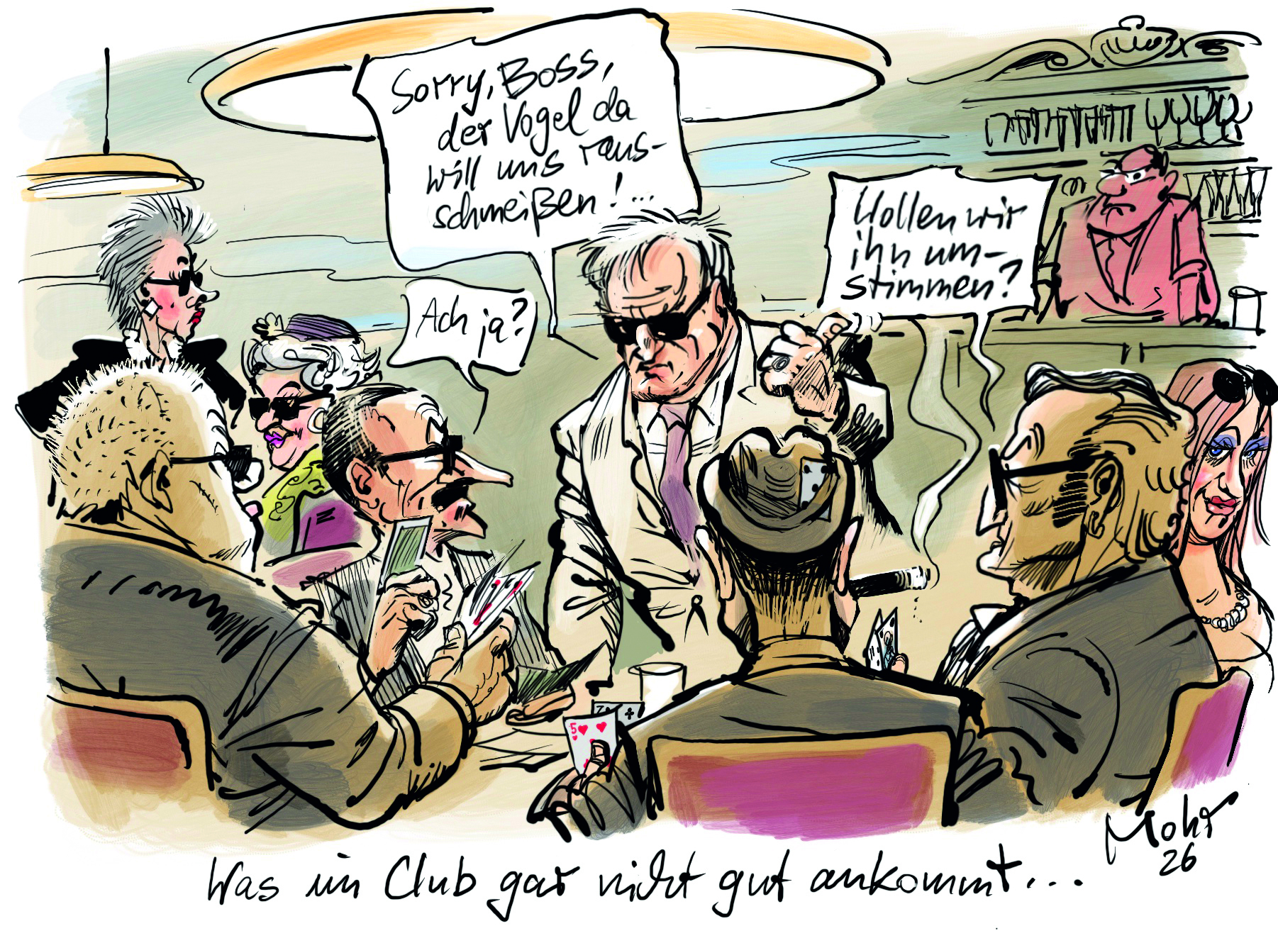 Eines Abends kam die wahre Ursache für die rätselhafte Ablehnung des Wirts ans Licht: An diesem sehr sonnigen Abend war ein Spieleabend eingeplant. Die Freunde trafen in ihren dunklen Jacketts und mit Sonnenbrillen im Lokal ein und saßen nun fröhlich lachend beieinander, spielten Skat, Mau-Mau oder knobelten. Allerdings gelang es diesmal dem Präsidenten nicht, dem Wirt auch nur die geringste freundliche Geste abzuringen. Stattdessen nahm dieser den Präsidenten zur Seite und teilte ihm mit bebender Stimme und hochrotem Kopf mit: „Mein Haus ist ein ehrwürdiges Haus. Aber dass Sie alle in Wirklichkeit von der Mafia sind, vermute ich schon lange. Den Saal nun in eine Spielhölle zu verwandeln, dulde ich nicht mehr. Suchen Sie sich etwas anderes.“ Gutes Zureden half nichts, selbst die Unterstützung einiger in Konfliktmanagement geübter Freunde blieb ergebnislos.