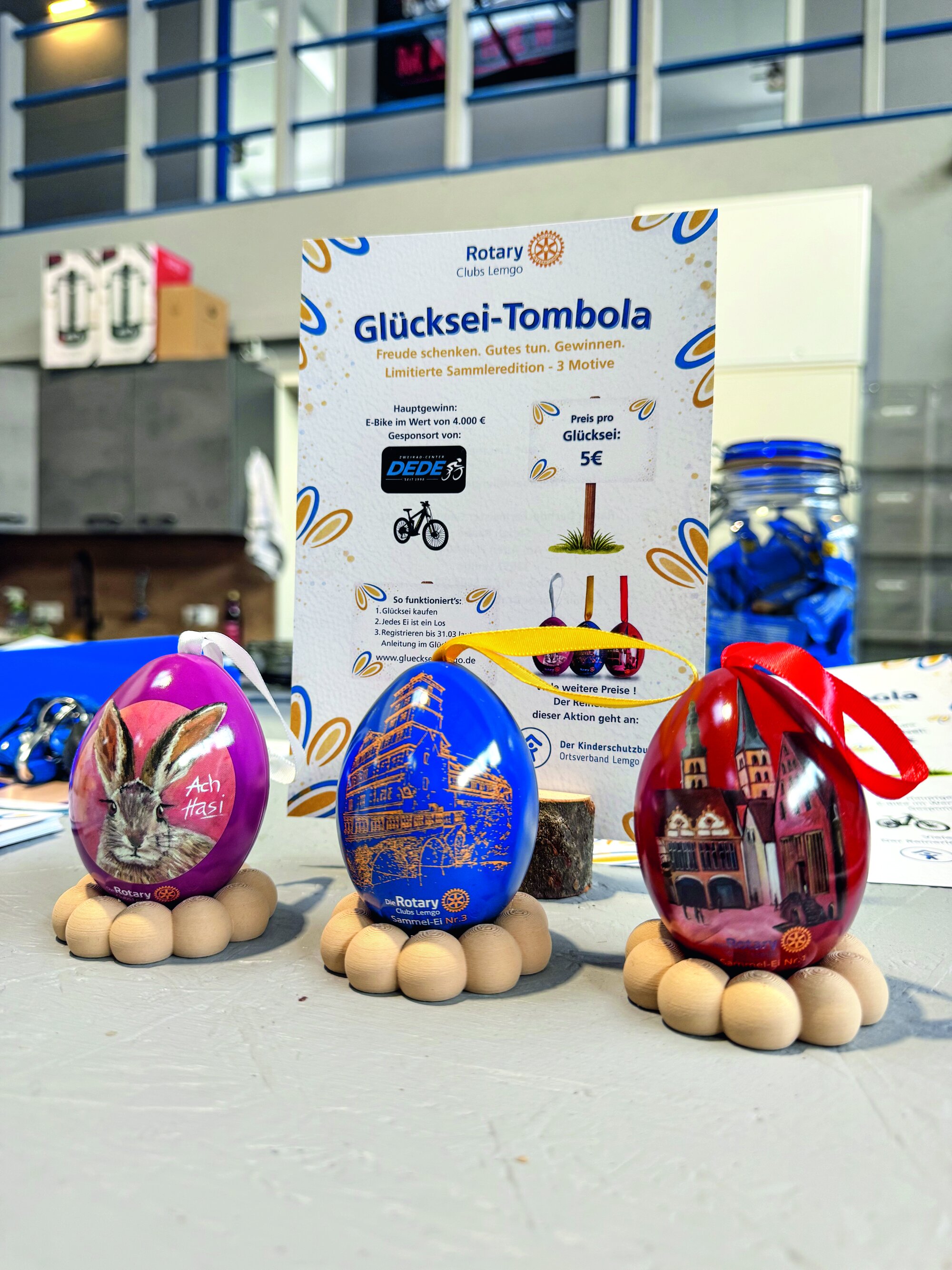 Eifriges Eierverpacken in der Lagerhalle von Dachdeckermeister Stefan Raabe (RC Lemgo-Sternberg): Rund 50 Rotary-Mitglieder der RCs Lemgo, Lemgo-Sternberg und Lemgo-Hanse trafen sich, um die diesjährige Glücksei-Aktion vorzubereiten. Es galt, 4000 Eier auszupacken, mitLos-Nummern zu bekleben und für die Auslieferungvorzubereiten. Die Eier bringen nicht nur Glück – zugewinnen sind Preise im Wert von 4000 Euro –,sondern sind zugleich kleine Kunstwerke, die mit Motiven des lokalen Künstlers Eckhard Siekmann gestaltet wurden. Mehr zur bundesweiten Glücksei-Aktion: Auf einen Blick