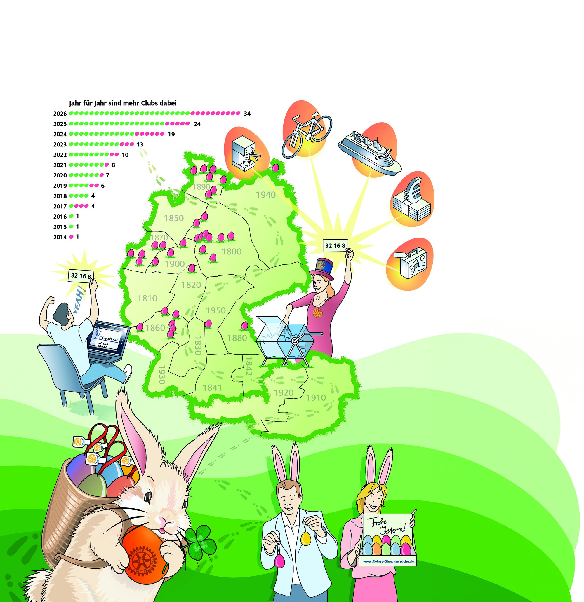 „Hat mein Ei gewonnen?“ lautet Ostersonntag eine der wichtigsten Fragen bei den Besitzern der circa 120.000 Glückseier im Wert von über 600.000 Euro, die in den letzten Wochen von 34 Clubs in zehn Distrikten für überwiegend fünf Euro pro Stück verkauft wurden. Denn nachgucken lohnt, die Clubs sammeln jedes Jahr wertvolle Preise für die Verlosung. Veröffentlicht werden die Gewinnzahlen auf der Glücksei-Webseite. Der Gewinn aus der Lotterie steht dann für die eigenen Clubprojekte zur Verfügung. Ausgedacht haben sich das die Freunde vom RC Neumünster-Vicelin, die auch die Markenrechte am Begriff „Glücksei“ eintragen ließen.