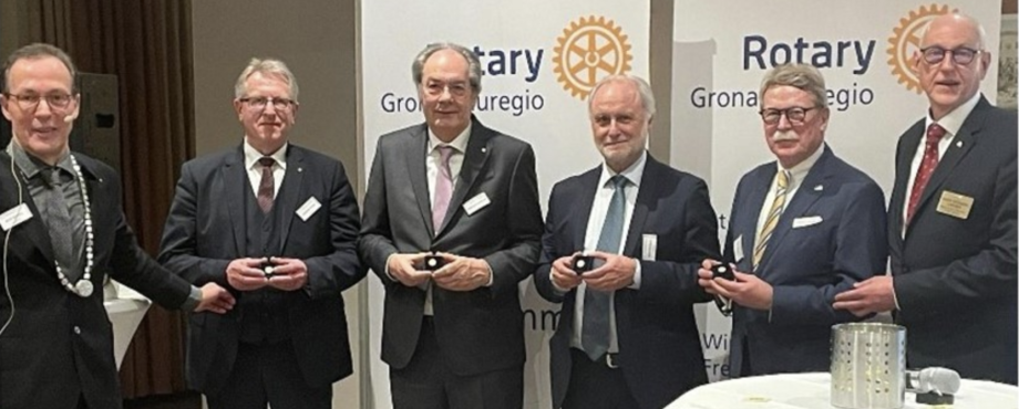 Präsident Gerd Egbrink begrüßte eine Vielzahl von Ehrengästen benachbarter Clubs aus der Grenzregion. Governor Hans-Eckard Langer aus Düsseldorf überbrachte eine Anerkennung des Weltpräsidenten Gordon McInally.