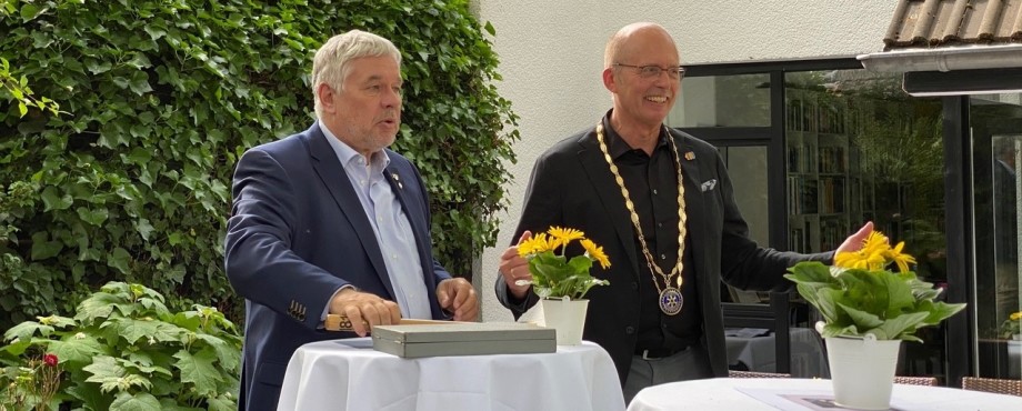 ... aber Corona-bedingt musste umdisponiert werden und der "Festakt" der Amtsübergabe fand nun in ganz kleinem Kreis im Privatgarten statt. Dank dafür gilt den Freunden des Rotary Club Bergisch Gladbach, die sich zusammen mit Helmut Rassfeld mit großem Engagement auf die Betreuung der Gäste eingestellt hatten. Die Arbeitssitzung und die notwendigen Abstimmungen wurden via Internetkorrespondenz erledigt. Die Clubs hatten die Statusberichte erhalten und waren um ihr Votum gebeten worden. Insgesamt haben sich 52 Clubs von 83 an der Abstimmung beteiligt. Alle Beschlussvorlagen wurden mit qualifizierter Mehrheit gebilligt. Damit haben wir also das rotarische Jahr 2019/20 ordnungsgemäß abgeschlossen und für 2020/21 die nötige Planungssicherheit geschaffen.