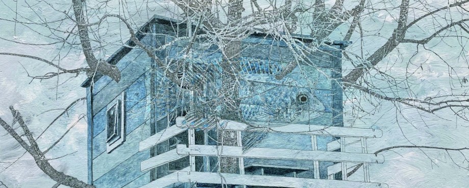 Auch jetzt arbeitet er oft lange an einem Bild. Das schnell Hingeworfene ist seines nicht. Geordnet stehen Köcher mit feinen Stiften und kleinen Pinseln auf dem Arbeitstisch. Die Staffelei wirkt fast zu wuchtig für die meisten seiner Bilder. Er braucht keinen großen Saal als Atelier. Wichtiger ist ihm der Blick hinaus. Das große Fenster lässt den Kaunergrat hereinschauen. Berge, Schnee. Viel Weiß haben auch die Bilder. „Die Lockdowns der Coronapandemie hatten auch ihr Gutes“, sagt er, „der Rückzug in die eigenen vier Wände hat die Sinne geschärft, auf die nächste Umgebung, auf das Wetter, das eigene Ich.“ – „Wetterfühlen“ heißt demnach auch die jüngste Werkserie. Sie zeigt das Fühlen mit der Natur. Oft in Rückbezügen auf seine Kindheit. Ein Baumhaus. Ein Klettergerüst, Hütten, ein Zelt. Atmosphärische Farbräume, zart, nur manchmal ein kräftiger Akzent. „Ich kombiniere Dinge miteinander, die zunächst keinen Bezug zueinander haben, die damit aber neue Perspektiven bekommen.“