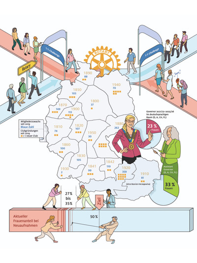 Rotary verliert kontinuierlich Mitglieder, im letzten Jahr weltweit über 12.000. Hierzulande sieht es etwas besser aus, aber es besteht Handlungsbedarf. Mitgliederschwund in Verbindung mit sinkenden Einnahmen ist nicht nur für unsere Projekte und Wirksamkeit von großem Nachteil, er ist auch in Diskussionen mit global tätigen Partnern nicht gerade hilfreich. RI Coordinator Membership Jan Mittelstaedt und sein Team haben zahlreiche Statistiken der letzten fünf Jahre analysiert und daraus zwei erfolgversprechende Empfehlungen entwickelt: Die Aufnahme von Männern und Frauen im Verhältnis 1:1 und die Gründung von Themenclubs, die für Zulauf von Mitgliedern sorgen könnten, für die Rotary bislang kein Thema war. 31 Prozent beträgt der Anteil weiblicher Neumitglieder im Durchschnitt – in den letzten fünf Jahren über alle deutschsprachigen Distrikte.