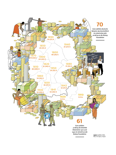 Mit den EREY-Spenden (Every Rotarian Every Year) fördert die Rotary Foundation lokale und internationale Club-Projekte über das Grant-System. Die Karte zeigt den bisherigen Stand der Spendeneingänge zum 1. März an, daneben steht zum Vergleich in Klammern der APF-Beitrag aus dem Vorjahreszeitraum. Es erleichtert den Distrikten die Planung für die Förderung von Projekten mit Zuschüssen der Rotary-Foundation, wenn alle Clubs ihre APF-Spende bis März des aktuellen rotarischen Jahres leisten.