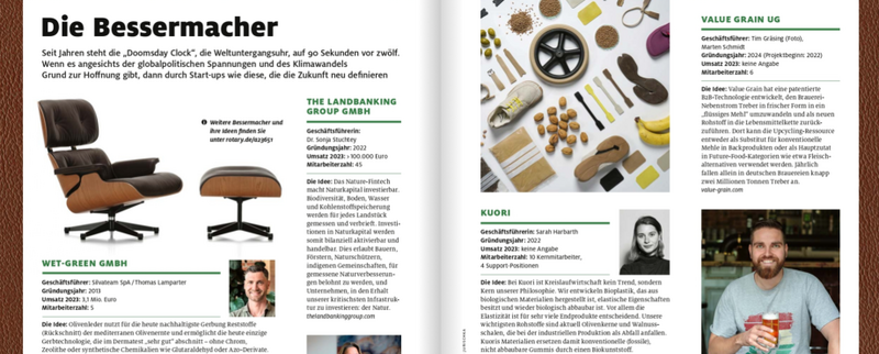 Die Idee: Value Grain hat eine patentierte B2B-Technologie entwickelt, den Brauerei-Nebenstrom Treber in frischer Form in ein "flüssiges Mehl"“ umzuwandeln und als neuen Rohstoff in die Lebensmittelkette zurückzuführen. Dort kann die Upcycling-Ressource entweder als Substitut für konventionelle Mehle in Backprodukten oder als Hauptzutat in Future-Food-Kategorien wie etwa Fleischalternativen verwendet werden. Jährlich fallen allein in deutschen Brauereien knapp zwei Millionen Tonnen Treber an.