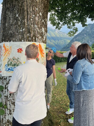 Bedeutsam war dabei nicht nur das gemeinsame "Bemalen" der Leinwand. Auch das Übermalen erster Striche von Vorgängern und das dabei Rund-um-die-Linde-Wandern verband Malende und Motive. Auf diese Weise verwebten sich in einem gemeinsamen Malprozess Strukturen und Farben zu einem bunten Teppich, der nicht nur am Baum wirkte. Eine symbolische Stärkung, um "Unite for Good" – Gemeinnützigkeit, Freundschaft und Frieden – zu fördern.