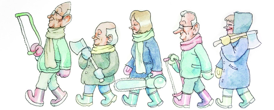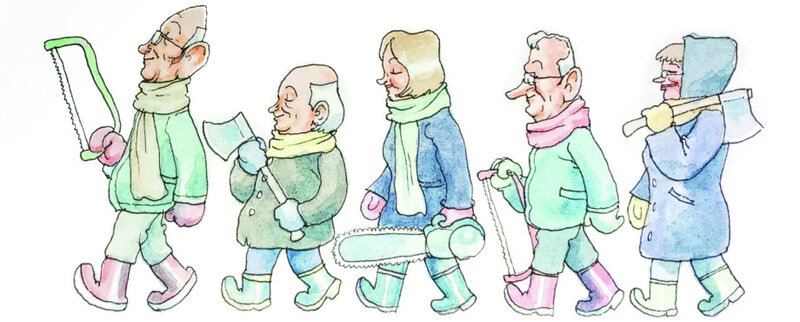 Rumpelbauer freute sich, denn auch er war der Natur verbunden und wollte am Baumschlagtag unter freiem Himmel einen Vortrag über das sensible Ökosystem Wald halten. Kassierer Knödler war ebenfalls angetan: „Für jeden selbst geschlagenen Baum ziehen wir zusätzlich eine kleine Spende für das Kinderheim St. Eulalia ein.“