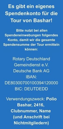 Der Distrikt überwies insgesamt 25.400 Euro auf das End-Polio-Spendenkonto bei RDG. Damit wuchs die Summe, die Bashar Asfour in den vergangen 12 Tagen für die großte rotarische Aktion eingeworben hat, auf 83,309 US-Dollar an. Das entspricht in etwa einem Drittel des Ziels, das Bashar mit seiner #MyJourneyToEndPolio - Tour anvisiert hat. 250.000 US-Dollar – damit liegt die Latte ziemlich hoch. Doch es liegt noch ein großer Teil der Tour vor ihm. Das Ziel kann erreicht werden.