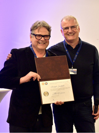Mit der höchsten Auszeichnung, „Fellow of Honor“, wurde Freund Christoph Sandkötter vom RC Münster 1648 ausgezeichnet. Im Rahmen des Wintermeetings der „International Fellowship of Motorcycling Rotarians“ im Brauhaus Früh zu Köln, wo sich 100 motorradfahrende Freundinnen und Freunde trafen. Diese Auszeichnung verleiht das 550 Mitglieder zählende Chapter, „Austria, Germany, Switzerland“ nur einmal pro Jahr und der Orden kann sich durchaus sehen lassen: Aus massivem Silber, Gold und in der Mitte verziert durch einen Feueropal, angesteckt durch den Präsidenten Olaf Klein vom RC Krefeld-Greiffenhorst, ehrt er das Engagement des Gründungsmitglieds der ersten Stunde (1999) das seit 25 Jahren für alle Designs und Devotionalien verantwortlich zeichnet, 21 Touren organisiert hat und dabei eine große Summe an Spenden eingeworben hat. Die Fellowship hat im Laufe der Jahre mehr als eine halbe Million Euro an Spenden für soziale Projekte bereitgestellt.