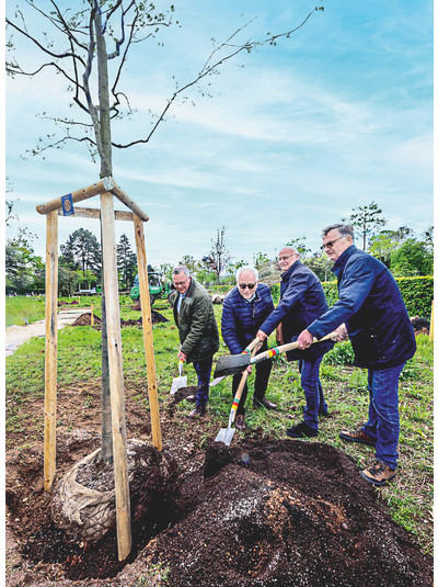Der so entstehende „Klimabaum“-Hain wird dazu beitragen, der wachsenden Hitzesituation in der Stadt entgegenzuwirken, und gleichzeitig ein Erholungsgebiet für die Bürgerinnen und Bürger der Stadt schaffen. Dass die Baumarten nicht alle einheimisch sind, hat den Grund, dass auf die Verträglichkeit im Zuge des Klimawandels geachtet wurde. „Assistierte Migration“ nennt der Fachmann das. Mongolische Linden zum Beispiel ziehen keine Läuse an, denn auch für den Zuzug von Schädlingen ist der Kli mawan del verantwortlich. „Es handelt sich nicht um eine einmalige Initiative des Clubs. Die Rotary-Mitglieder werden sich hier dauerhaft engagieren“, betont Eiden.