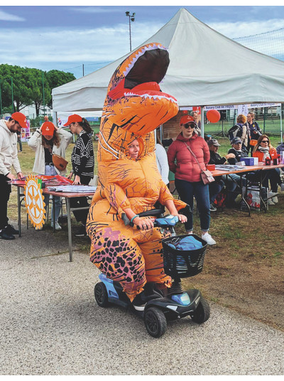 Was war das für ein kurioser Anblick? Mehr als ein Dutzend Rotary-Mitglieder und Freunde im Südosten Frankreichs zogen sich aufblasbare Dinosaurierkostüme an und stolperten in einem spielerischen Wettlauf über einen 100-Meter-Parcours, um Spenden und Aufmerksamkeit für Rotarys Mission zur Ausrottung von Polio zu sammeln. Die Zuschauer konnten dabei Wetten auf die Teilnehmer abschließen. Das vom Distrikt 1730 organisierte T.-rex-Rennen fand während des Internationalen Luftfestivals von Fréjus statt, einem Drachenfest, das Tausende von Menschen anzieht. „Ich hatte die Idee, eine Veranstaltung ins Leben zu rufen, um das Image von Rotary im Kampf gegen die Kinderlähmung aufzufrischen“, sagt Dinh Hoan Tran, Governor des Distrikts und Mitglied des Rotary Clubs Nizza. Mehr als 40 Clubs nahmen an der Veranstaltung teil, und es kamen insgesamt 45.000 Dollar zusammen.
