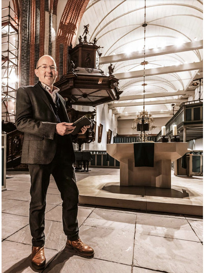 Beim Betreten der rund 80 Meter langen Ludgeri-Kirche in Norden in Ostfriesland geht plötzlich das Licht an. Jürgen Klensang steht weit hinten in der Mitte des Ganges und hat im richtigen Moment auf den Schalter gedrückt. Um einen Wow-Effekt zu erzielen. So wie immer bei seinen Projekten. Das Spiel mit dem Licht ist sein Ding.