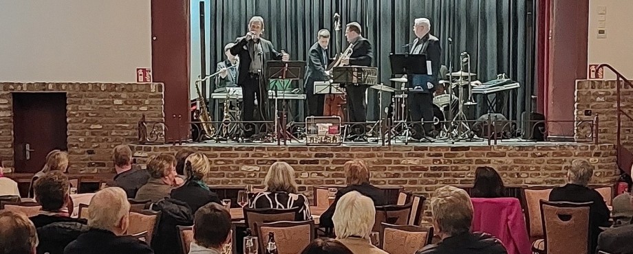 Diese hatte ein Programm zusammengestellt, welches die Stimmung im Saal immer mehr steigen ließ. Songs wie "Toot, toot, tootsie good bye", "Buena sera, signorina", "Mack the knife" oder auch "Tuxedo Junction" wurden in zwei Blöcken à 45 Minuten vorgetragen. Was zunächst mit einem leichten Wippen der Füße begann, entwickelte sich bei vielen der Anwesenden mit der Zeit zu rhythmischem Mitschwingen des Oberkörpers. Offensichtlich war es der Climax-Band am Ende des Abends gelungen, für eine großartige Stimmung im Saal zu sorgen, was sich dann auch in lautstarken Zugabe-Rufen äußerte. Dem kamen die Climax mit "What a wonderful world" nach und duften sich danach am verdienten langanhaltenden Beifall erfreuen.