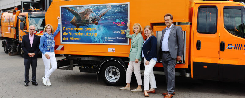 Die Fotos von Schildkröten, die in Plastiknetzen verschlungen hilflos im Meer schwimmen, oder Seevögeln, in Plastiktüten gefangen: Plastikmüll ist ein dramatisches Problem für die Weltmeere. Um darauf eindringlich aufmerksam zu machen, haben sich der RC Düsseldorf-Nordhrein und der RC Neuss mit einem weiteren Partner zusammengetan: Für das Projekt End Plastic Soup arbeiten sie mit der örtlichen Müllabfuhr zusammen. Sie werben auf der Fahrzeugflotte der Müllabfuhr für die Reduktion von Plastikmüll. Bei der Vorstellung der neuen Werbung bei der AWISTA GmbH Düsseldorf, machten Dominique Metz, Präsidentin des Rotary Clubs Düsseldorf-Nordrhein, und Dieter-Alfred Paul vom Rotary Club Neuss deutlich, wie sehr sie sich und die Mitglieder der beiden Clubs über die gemeinsame Aktion mit den örtlichen Entsorgungsunternehmen Awista GmbH und Abfall- und Werkstofflogistik Neuss GmbH freuen. Für die Aktion können die Fahrzeuge als Werbefläche für die Umweltsache genutzt – und so das Bewusstsein der Bürger ganz plakativ geschärft werden. Die beiden Rotarier und Peter Ehler, Sprecher der Geschäftsführung der AWISTA GmbH, wiesen auf die Bedrohung der Tier- und Pflanzenwelt hin, die durch nicht sachgerechte Entsorgung von Plastikmüll entsteht. Zudem trage die Freisetzung klimaschädlicher Gase zur Erderwärmung bei. Mit einer ähnlichen Aktion hatte auch der RC Aachen vor zwei Jahren schon erfolgreich auf End Plastic Soup aufmerksam gemacht.