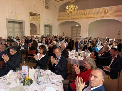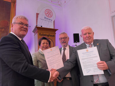 In Grußworten von Präsident Friedrich Lazarus, Governor Linda Gebser, Vertretern der Stadt und umliegender Clubs stand ein Gedanke im Zentrum: Engagement lebt vom Mitmachen. Festredner Prof. Dr. Edgar Grande betonte die Parallelen zwischen Rotary und Demokratie – beide funktionieren nur, wenn viele aktiv Verantwortung übernehmen.
