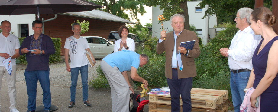 Governor Klaus Brodbeck und Präsident Lothar Tietze begrüßten Freundinnen und Freunde aus drei ukrainischen, einem brasilianischen und drei deutschen Clubs zur traditionellen Weinbergwanderung des RC Lahr. Hauptthema war die Ukrainehilfe. Klaus Brodbeck erläuterte das Projekt Stromgeneratoren, deren Wirkung Iryna Polunina, Präsidentin RC Kharkiv-Phönix, als "segensreich" beschrieb. Valerii Pavlovskyi, Ass. Governor, RC Dnipro-City, dankte für Medikamente und Hilfsmittel, Jochen Dietz aus Lahr erläuterte das überregionale Großprojekt mit dem RC Dnipro: OP-Instrumente für die frontnahe Trauma-Klinik.