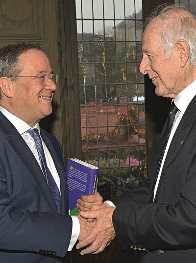 Im Rahmen des größten deutschen Gemeindienstprojektes „Lesen lernen – Leben lernen (4L)“ überreichte Projektinitiator Helmut Falter (r.) durch den Ministerpräsidenten von Nordrhein-Westfalen Armin Laschet (l.) das millionste Buch an Schüler der KGS Höfchensweg Aachen.