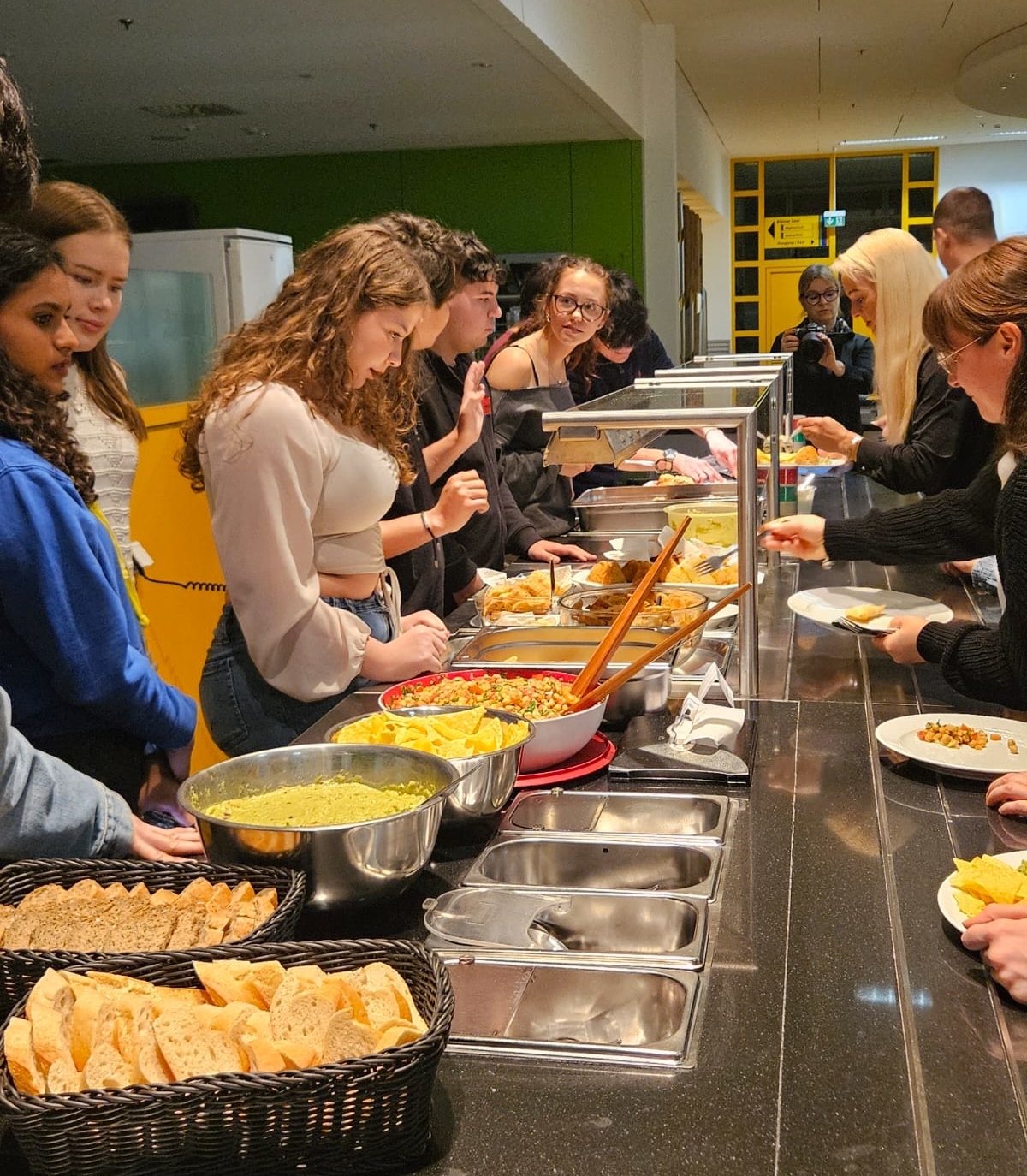 Die unterschiedlichen Herkunftsländer, die Sprachenvielfalt und Sprachkompetenz spiegeln sich auf dem üppigen Buffet wieder. Auf einer Speisekarte wird erklärt, dass beispielsweise Bauti aus Argentinien die Vorspeise Empanadas de carne (Teigtaschen mit Rindfleischfüllung) zubereitet hat, Gabriela aus Brasilien hat Coxinha de Frango (Hähnchenkroketten) gekocht, die Onion Rings (Zwiebelringe) wurden von Eilee aus den USA gebraten, Rin aus Japan servierte Yakisoba (Buchweizen-Nudeln) und hinter Xiangyù Dìgua Wán Taro (Süßkartoffel-Bällchen) steckt Sandra aus Taiwan. Das Rezept für Käännetty teksti (Kardamom-Schnecken) hat Elsa aus Finnland mitgebracht.