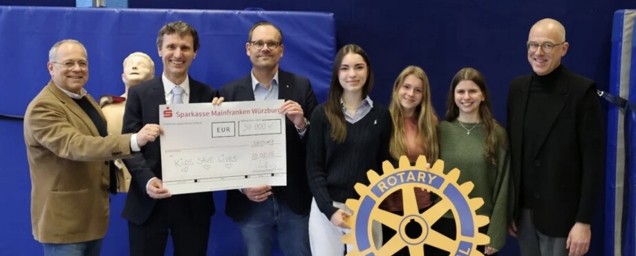 Mit einer beeindruckenden Summe von 30.000 Euro unterstützen die drei initiierenden Würzburger Rotary Clubs, mit Unterstützung der Clubs aus Karlstadt-Arnstein, Lohr-Marktheidenfeld und Kitzingen, das bundesweite Projekt "Kids Save Lives". Ziel der Aktion ist es, Schülerinnen und Schüler frühzeitig in lebensrettenden Reanimationsmaßnahmen zu schulen. Im Mittelpunkt der Veranstaltung am Matthias-Grünewald-Gymnasium Würzburg stand neben der symbolischen Scheckübergabe vor allem der praktische Nutzen: Wie kann jeder Einzelne Leben retten? Die Antwort: Prüfen. Rufen. Drücken. Drei einfache Schritte, die über Leben und Tod entscheiden können.