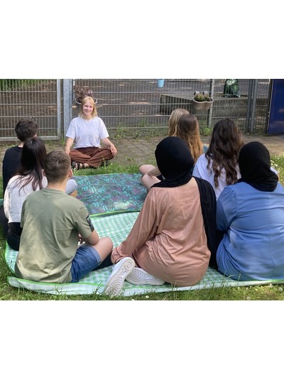 Auf der Wiese hinter dem Kursraum sitzen die Jugendlichen jetzt mit geschlossenen Augen auf einer Decke. Pia Burghartz gibt Hinweise, wie sie mit den Gedanken durch ihren Körper wandern sollen. "Nehmt nun euren Rücken wahr. Wie fühlt er sich im Moment an? Könnt ihr Verspannungen wahrnehmen?" Die längere Konzentration fällt nicht allen leicht, nach einiger Zeit kommt Unruhe auf, leises Kichern ist zu hören.