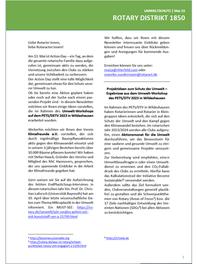 Der aktuelle Umwelt-Newsletter verweist auf den deutschlandweiten Rotary-Aktionstag und will Mut machen, mit kleinen Aktionen die Öffentlichkeit in den Umweltschutz einzubinden und mit Bürgern über Rotary ins Gespräch zu kommen. Einige Ideen liefert der Newsletter gleich mit:
