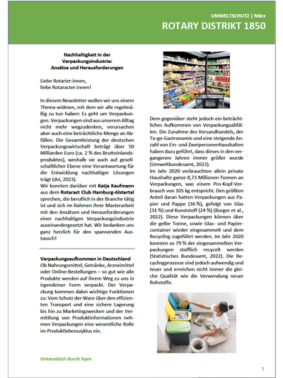 Doch noch immer vermüllen Abfälle unsere Umwelt. Deshalb muss die Frage gestellt werden: Geht es in Zukunft an vielen Stellen auch ohne Verpackung? Diskutieren sollten die Clubs zum Beispiel auch über die Nutzung von Mehrweg-Verpackungen, -Flaschen etc. Ein großes Feld für Diskussionen, wie der aktuelle Umwelt-Newsletter des Distrikts zeigt. Lesen Sie ihn — siehe rechts.