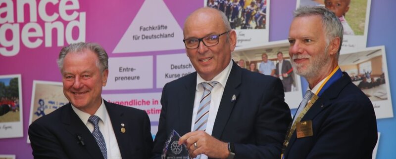 Dr. Frank Meik, der ehemalige Vorsitzende der Geschäftsführung der Frankfurter Allgemeinen Zeitung GmbH und Vorsitzender des Deutschen Governorrates in 2021/2022, hielt die Laudatio: "Heribert Trunk hat in seinem beruflichen, familiären und sozialen Leben Großes geleistet. Seine Stiftung 'Chance Jugend' gibt benachteiligten jungen Menschen eine Chance und unterstützt sie nicht nur durch aktive Beteiligung. Er ist ein Vorbild für alle Rotarier."