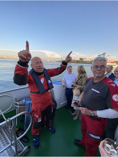 Kaum hatte Stephan Bastmann vom Rotary Club Rostock-Horizonte sein Amt als Clubpräsident übernommen, verschwand er zu einem Einsatz der besonderen Art. Um die beim Ämterwechsel erreichte Spendensumme noch zu erhöhen, stürzte er sich in die nur 17 Grad kalten Fluten der Warnow, um sich von den Seenotrettern der Deutschen Gesellschaft zur Rettung Schiffbrüchiger (DGzRS) aus dem Wasser retten zu lassen.