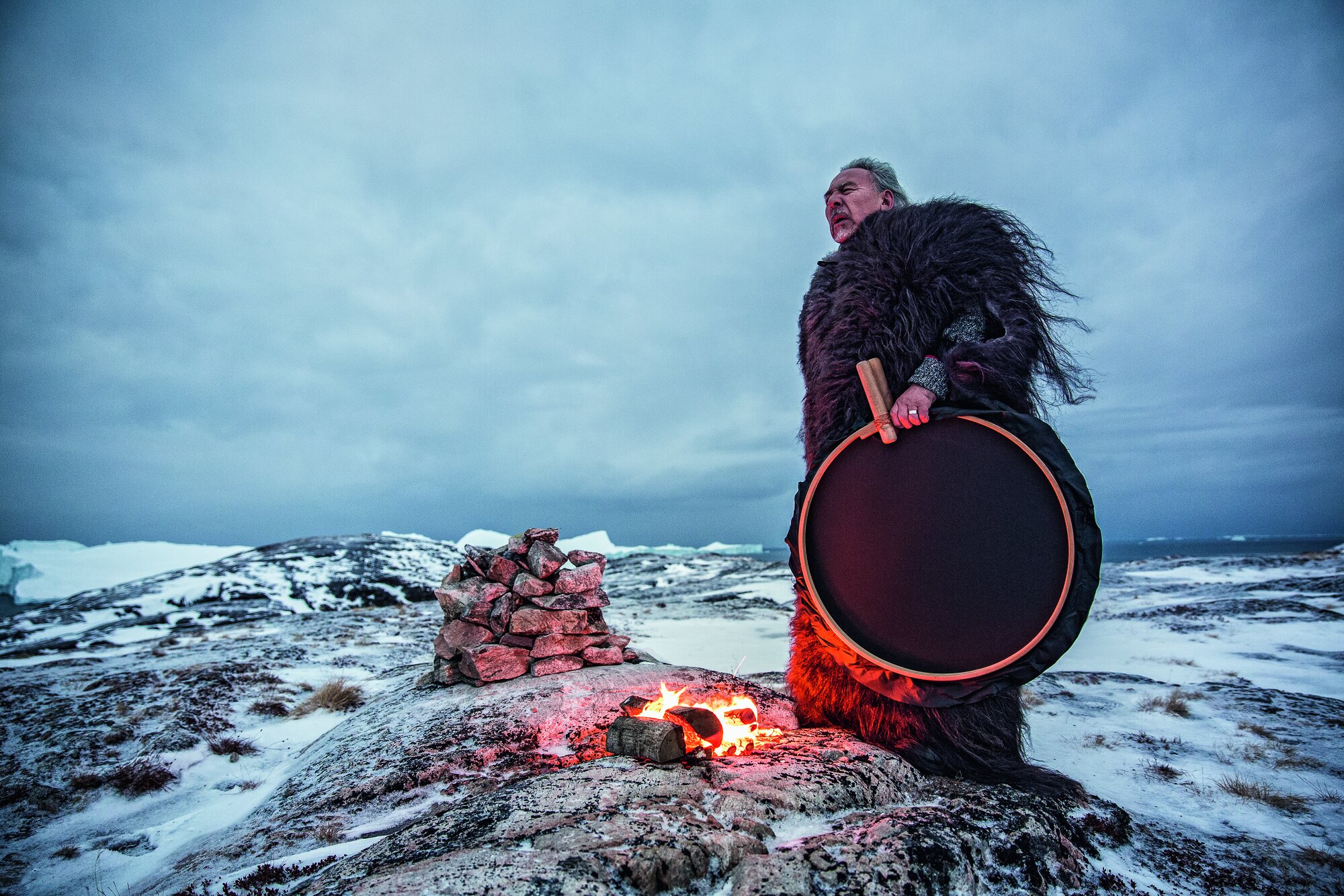 Am Unesco-Welterbe Ilullisat-Eisfjord: Angaangaq trägt ein grönländisches Moschusochsenfell und hält eine Qilaut-Windtrommel, ein zentrales Symbol seiner indigenen Heiltradition. Als Schamane, Geschichtenerzähler und Sprecher indigener Weisheit verbindet er alte Kultur mit aktuellen Fragen zu Umwelt und globalem Wandel. Eine seiner spirituellen Aufgaben lautet, „das Eis in den Herzen der Menschen zu schmelzen“.