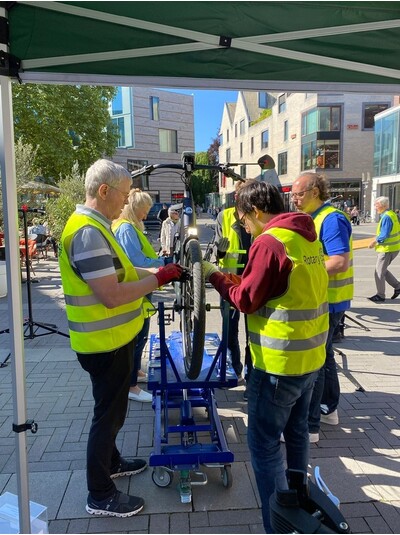 Für mehr Sicherheit für Fahrradfahrer haben Mitglieder der acht Münsterschen Rotary Clubs am Action Day gesorgt. Unter dem Motto "Münsteraner Rotarier für Münsteraner Bürger!" haben sie zusammen mit Rotaract und den Inner-Wheel-Damen mitten in Münster auf der Stubengasse kostenlos Speichenreflektoren an Fahrrädern montiert.